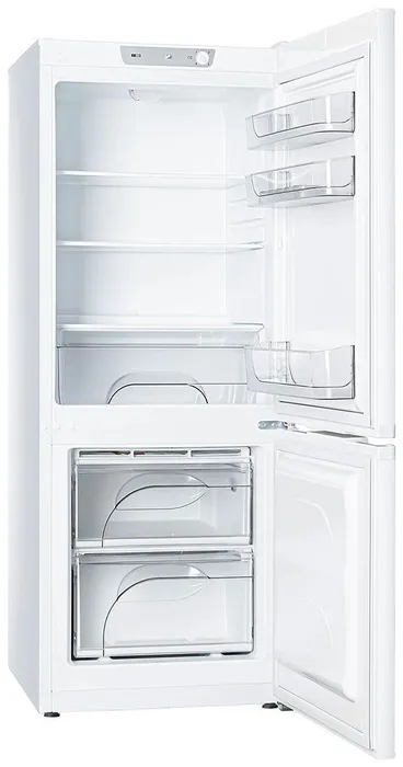 Atlant ХМ 4208-000 — Холодильник ATLANT ХМ-4208 оборудован нижней морозильной камерой объемом 53 л. Вместимость верхнего отделения — 132 л. Первый размораживается вручную, второй — автоматически с помощью капельной системы. Управление обеспечивают механические регуляторы. Двери выполнены из металла, перенавешиваются на обе стороны, снабжены скрытыми ручками. Эта модель обладает классом энергоэффективности А: за год расходует 261 кВт*ч электричества. При аварийном обесточивании продукты можно хранить в течение 14 часов. Инверторный компрессор обеспечивает тихую работу: максимальный уровень шума составляет 43 дБ. Морозилка оснащена двумя прозрачными пластиковыми ящиками. Производительность камеры — 2 кг/сутки. В комплекте — формочки для льда. Верхнее отделение оборудовано тремя стеклянными полками (их высоту можно менять), тремя дверными карманами и одним ящиком для овощей.