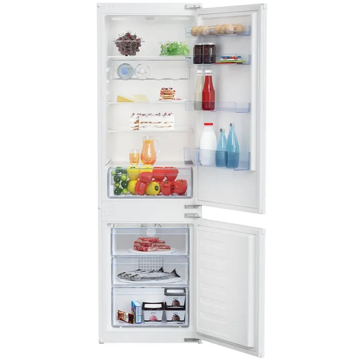 Beko BCHA2752S — Встраиваемый холодильник BEKO BCHA2752S – вместительная, удобная в использовании модель. Общий полезный объем устройства равен 262 л, из которых на холодильную камеру приходятся 193 л, а на морозильную – 69 л. Соответствуя классу энергопотребления A+, холодильник отличается невысоким (274 кВт) годовым энергопотреблением. Климатические классы устройства – SN-T. В морозильной камере используется размораживание No Frost. Размораживание в основной камере – капельное. Уровень шума в ходе работы холодильника не превышает 40 дБ. Холодильник BEKO BCHA2752S способен сохранять холод автономно в течение 13 ч. Внеплановые отключения электричества вряд ли доставят вам неудобства. Конструкцией модели предусмотрена полка для бутылок. Цвет внутреннего пространства холодильника традиционный – белый. Модель характеризуется размерами для встраивания 56x177.8-178.8x55.5 см. Ширина, высота и глубина холодильника равны 54, 177.5 и 54.5 см соответственно.