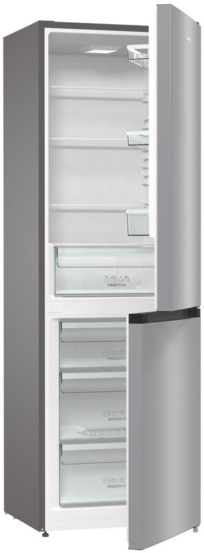 Gorenje NRK6191ES4 — Холодильник с нижней морозильной камерой Gorenje NRK6191ES4 обладает конструкцией, включающей в себя холодильную камеру, отделение для заморозки и зону свежести. В отделении для охлажденных продуктов расположены четыре основные полки, три полки на двери и ящик для овощей и фруктов. Отсек для замороженных продуктов включает в себя три прозрачных пластиковых ящика. Производительность по замораживанию составляет 12 кг/сутки. В зоне свежести находится один ящик из пластика. Размораживание обеих камер производится капельным способом. Предусмотрено наличие встроенного ионизатора воздуха. За управление отвечают электронная панель и цифровой дисплей с индикаторами включения и текущей температуры в холодильной камере. Конфигурацией модели предусмотрено наличие перенавешиваемых дверей с внутренними горизонтальными ручками и наружным покрытием из металла. Безопасная эксплуатация обеспечена световым и звуковым сигналом при повышении температуры и сохранением холода на протяжении 17 ч. Уровень шума — 38 дБ. В комплекте прилагаются подставка для яиц и формочки для льда. Модель выполнена в серебристом цвете. Габаритные размеры — 185х60х59,2 см.