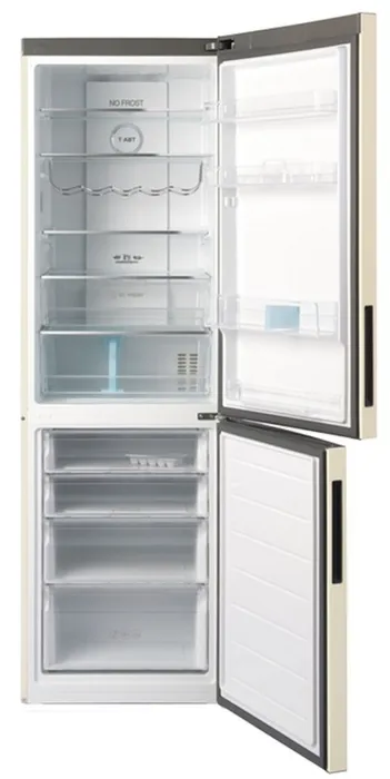 Haier C2F636CCRG — Холодильник с нижней морозильной камерой Haier C2F636CCRG изготовлен из металла, покрыт эмалью бежевого цвета. Оснащен технологией No Frost, благодаря чему на стенках прибора не образовывается иней. Общий объем холодильника составляет 364 литров. Предусмотрена зона свежести. Холодильная камера имеет 5 полок из стекла, морозильная – 4 ящика выдвижного типа из пластика. На дверце расположен дисплей для электронного управления. Поверхность прибора – матовая. Передние и задние ножки холодильника регулируются. Работает от 1 компрессора. Уровень шума при эксплуатации составляет 42 Дб. Внутреннее покрытие холодильника антибактериальное. Прибор дополнен функцией суперзамораживания, суперохлаждения, режимом ожидания. Дополнительные характеристики товара: предусмотрено светодиодное освещение; есть функция защиты от детей; в комплекте форма для льда, подставка под бутылки и яйца; оснащен вентилятором для предотвращения перегрева; дополнен индикатором температуры, звуковым оповещением об открытой двери.
