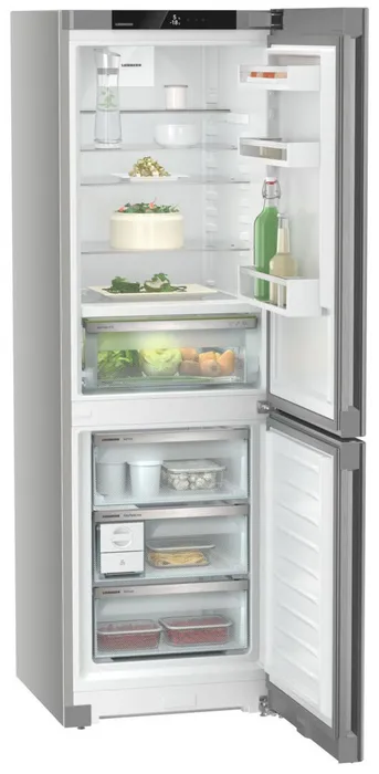 Liebherr CBNsfd 5223 — В холодильнике Liebherr CBNsfd 5223-20 001 есть отделение для фруктов и овощей с возможностью регулировки влажности. Предусмотрена система Duo Cooling с двумя раздельными контурами охлаждения. Объем основного отделения — 225 л, морозильника — 94 л. Внутри есть полки из закаленного стекла и выдвижные пластиковые ящики. При отключении питания условия, в которых хранятся продукты, не изменятся в течение 24 часов. Разморозка — автоматическая. Система управления — сенсорная. Есть режимы SuperCool и SuperFrost. Освещение обеспечивает LED-лампа. Максимальный уровень шума — 37 дБ. Есть фильтр FreshAir с активированным углем для удаления неприятных и резких запахов. Класс энергопотребления — A++. За год расход электричества составляет примерно 210 кВтч. Перенавешиваемые двери дополнены съемным уплотнителем. Есть сигнализация, предупреждающая о неисправностях и незакрытой двери.