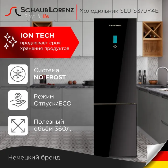 Schaub Lorenz SLU S379Y4E — Холодильник Schaub Lorenz SLU S379Y4E — модель с габаритами 201х59,5х65 см, весом 78 кг. Климатический класс — T, SN. Уровень шума во время эксплуатации не превышает 42 дБ. Общий объем камеры равен 379 л, из которой 360 л отводится на полезное пространство. Дверь выполнена из эмалированного металла. Основная камера (275 л) включает в себя четыре полки из закаленного стекла, складную, позволяющую разместить высокую посуду, для бутылок, отделение для овощей и фруктов, четыре пластиковых балкона, находящихся на двери. Светодиодное освещение дает возможность хорошо видеть пространство в темное время суток. Сухая зона свежести с прозрачным ящиком из пластика предназначена для долгого хранения овощей и фруктов. В морозильной камере (104 л) находятся три прозрачных пластиковых ящика. В устройстве реализована технология No Frost, за счет чего охлажденный воздух в отделении распределяется равномерно, не образуя наледь. За сутки замораживается до 8 кг продуктов. В качестве используемого хладагента выступает R600a. На передней поверхности дверцы расположен цифровой дисплей, который позволяет программировать температуру в отделениях и активировать функции и режимы. Класс энергопотребления — А++. За год расходуется всего 274 кВт*ч электричества. При желании можно переставлять двери с одной стороны на другую. Режим «Суперохлаждение» дает возможность охладить много продуктов за короткий промежуток времени. В случае оставления двери открытой, повышении температуры срабатывает звуковая сигнализация. При отключении питания холод сохраняется до 18 часов. В комплект входят две подставки для яиц, держатель для бутылок, лоток для льда.