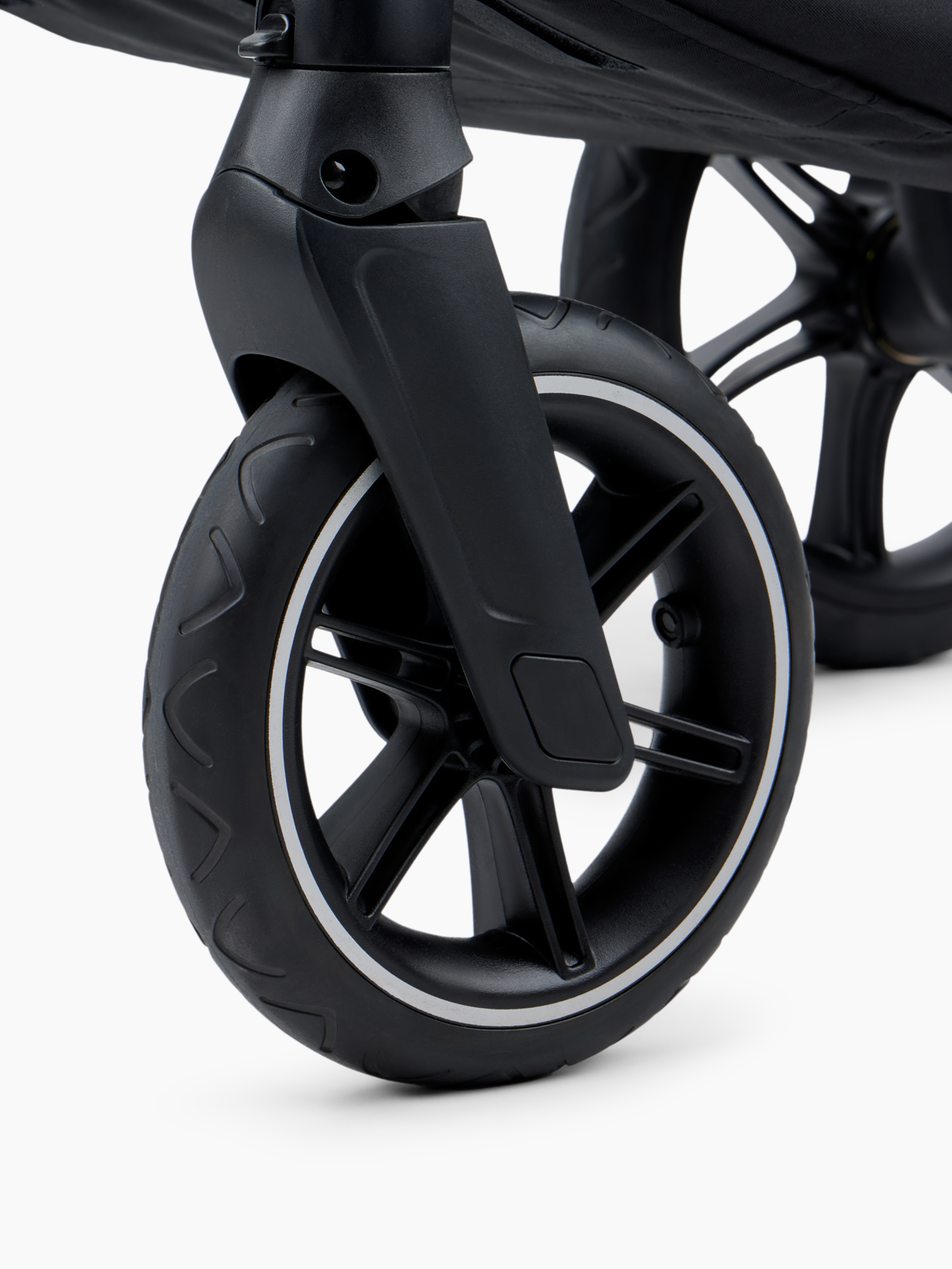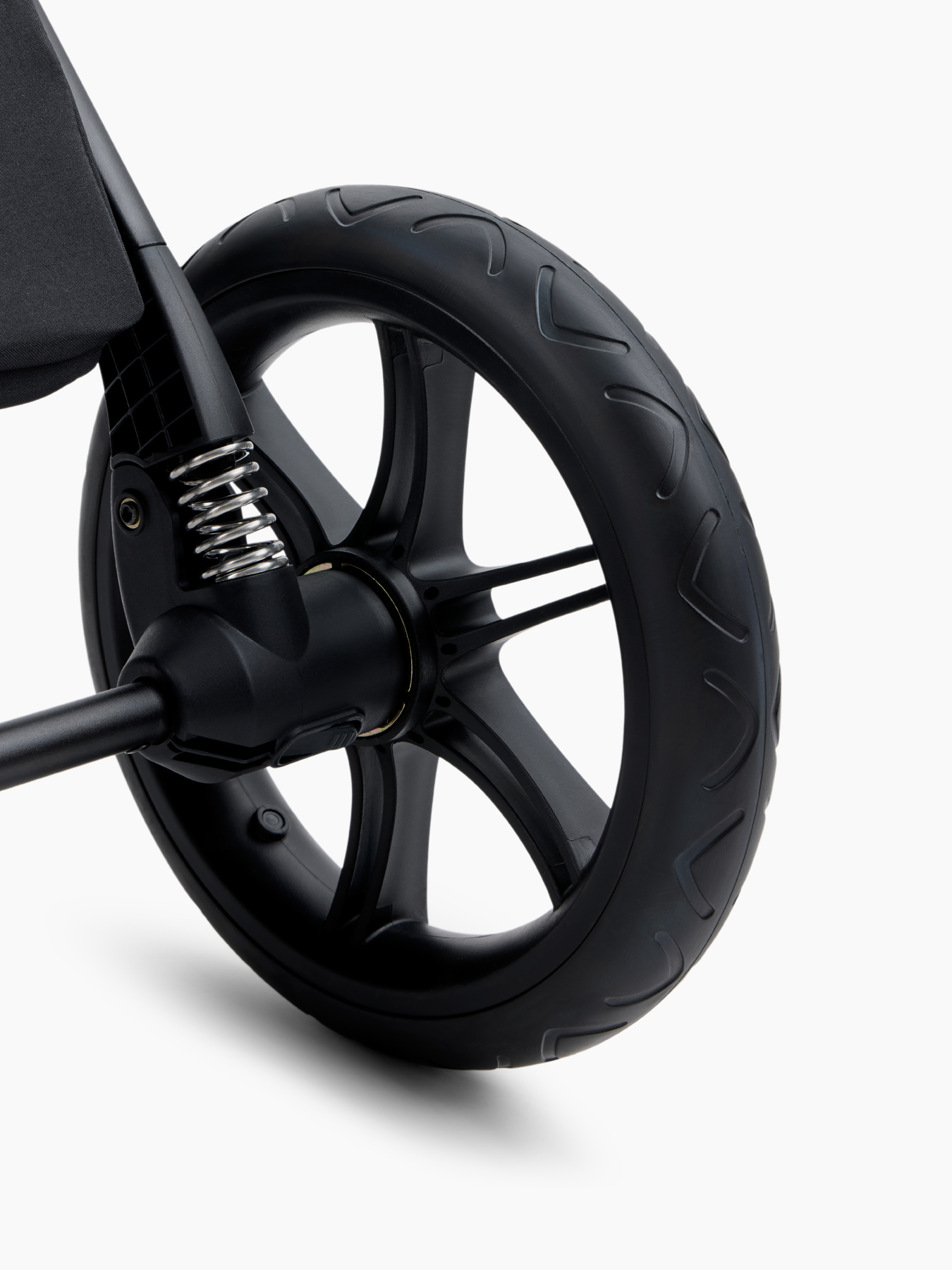 Большие гелевые колёса с пружинной амортизацией обеспечивают хорошую проходимость по снегу, песку и неровностям — это удобно для прогулок в любых условиях.