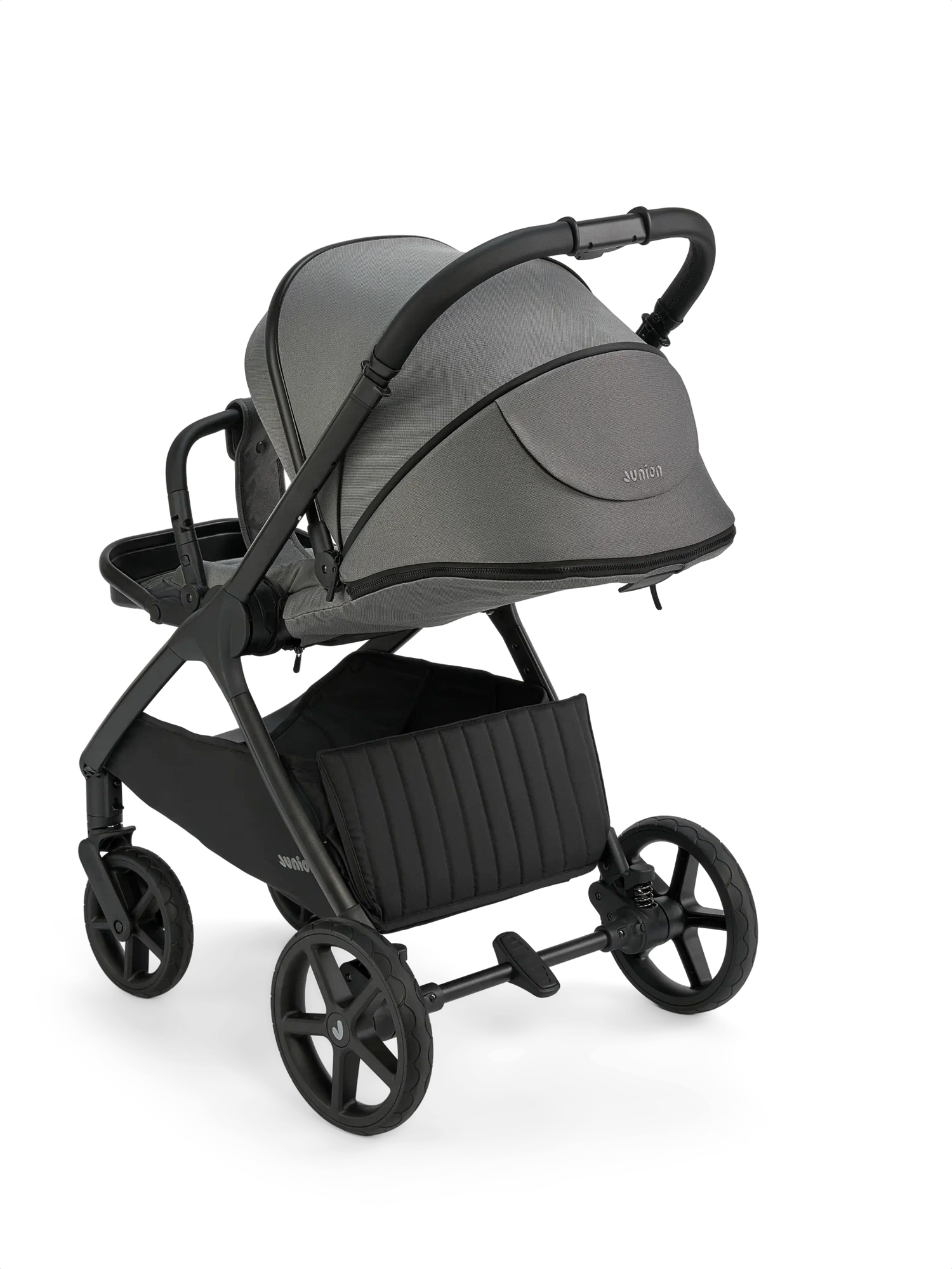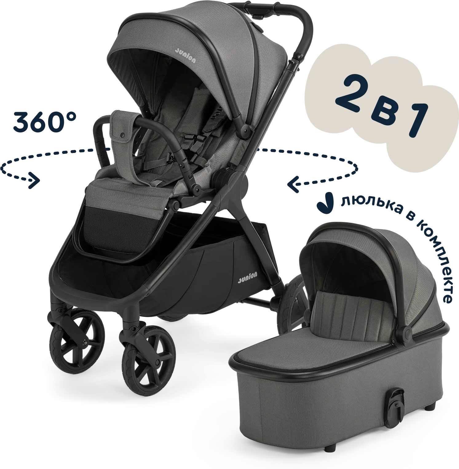 Junion Chillibom — подходит для малышей с самого рождения. В комплекте люлька для новорождённых и прогулочный блок для детей постарше.В люльке с утеплёнными стенками и мягким матрасиком малышу будет уютно и комфортно с первых дней жизни. Люльку и прогулочный блок можно установить как по направлению движения, так и лицом к родителям.Малыш надежно фиксируется в коляске пятиточечными ремнями, а для дополнительной безопасности и комфорта есть разделитель для ног и съемный бампер из экокожи.Колёса с наполнением EVA и резиновым протектором невозможно проколоть и не нужно подкачивать. Для максимальной манёвренности передние колёса поворачиваются на 360 градусов.