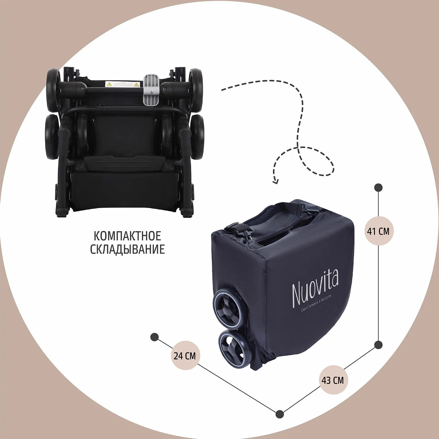 Nuovita Ritmo — прогулочная коляска разработана с учетом потребностей ребенка, в ней малышу будет комфортно и безопасно. Ширина спинки регулируется молнией. Малыш сможет сидеть, любуясь окрестностями, или спать, благодаря регулируемому наклону спинки. Она оснащена пятиточечными ремнями безопасности для комфорта и защиты вашего ребенка, даже если он очень активный и подвижный. Коляска удобна в транспортировке, благодаря специальной сумке - чехлу, которая оснащена удобной длинной ручкой с мягкой подкладкой для наплечного ношения.