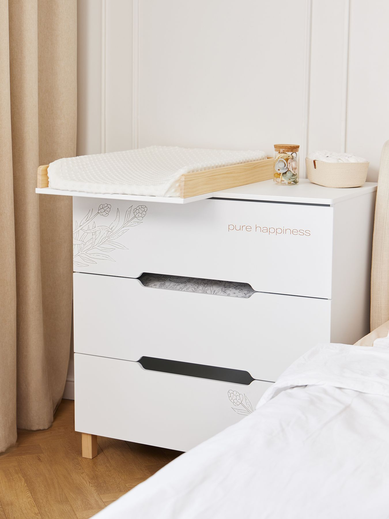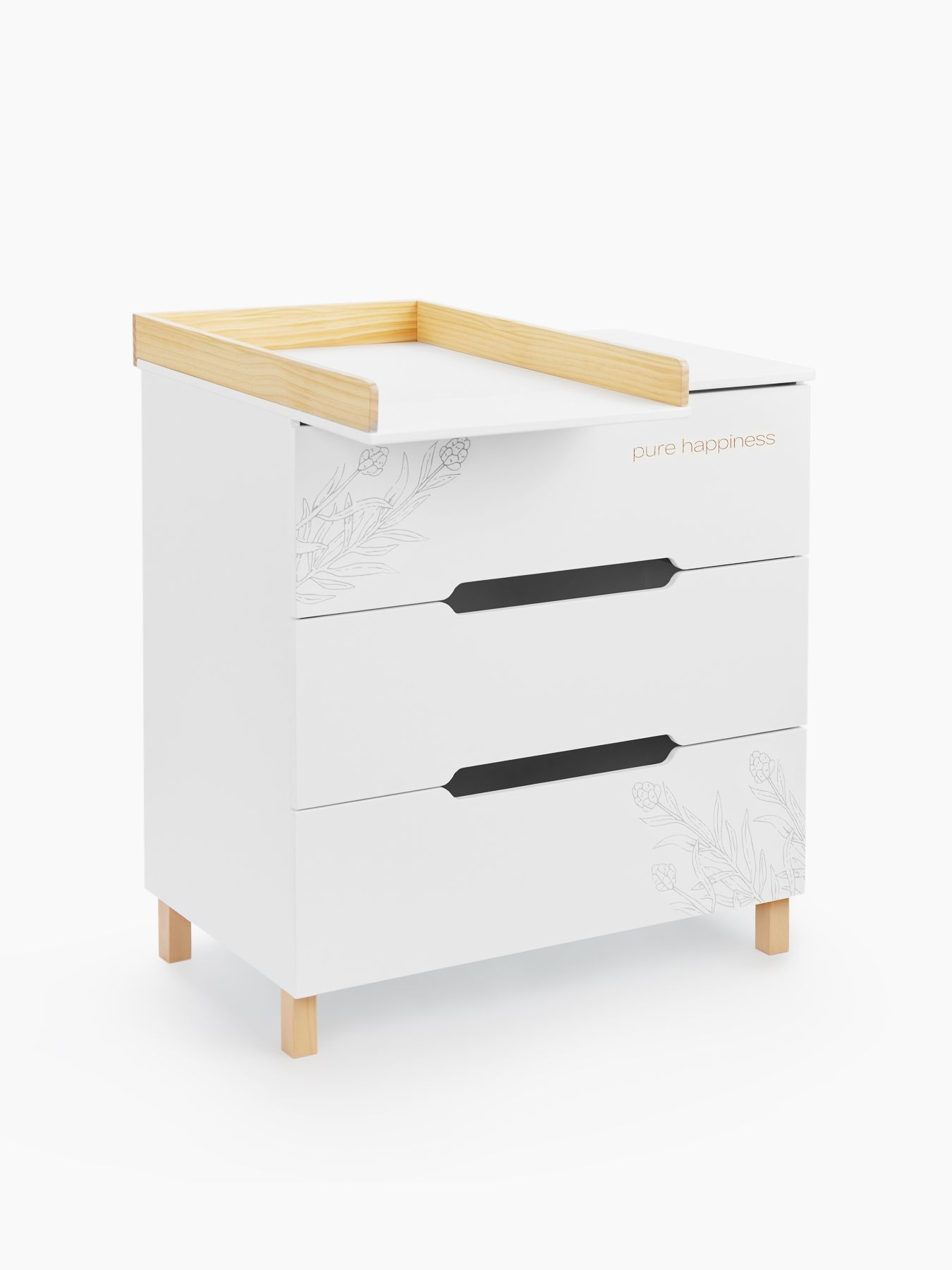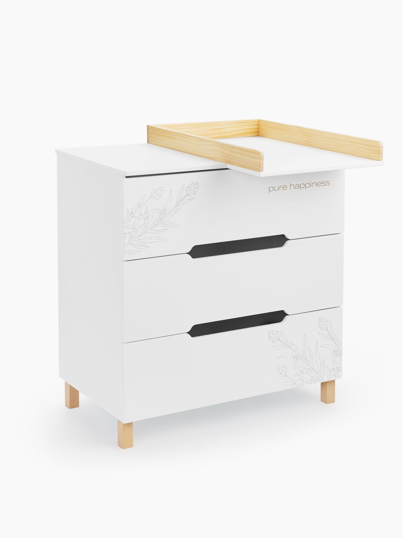 Happy Baby FIOKI — вместительный комод с продуманным пеленальным столиком и высокими бортиками для абсолютной безопасности. Стильный акцент в детской и максимум комфорта — глубокие ящики плавно открываются, а ножки из натурального дерева придают интерьеру особый уют.
