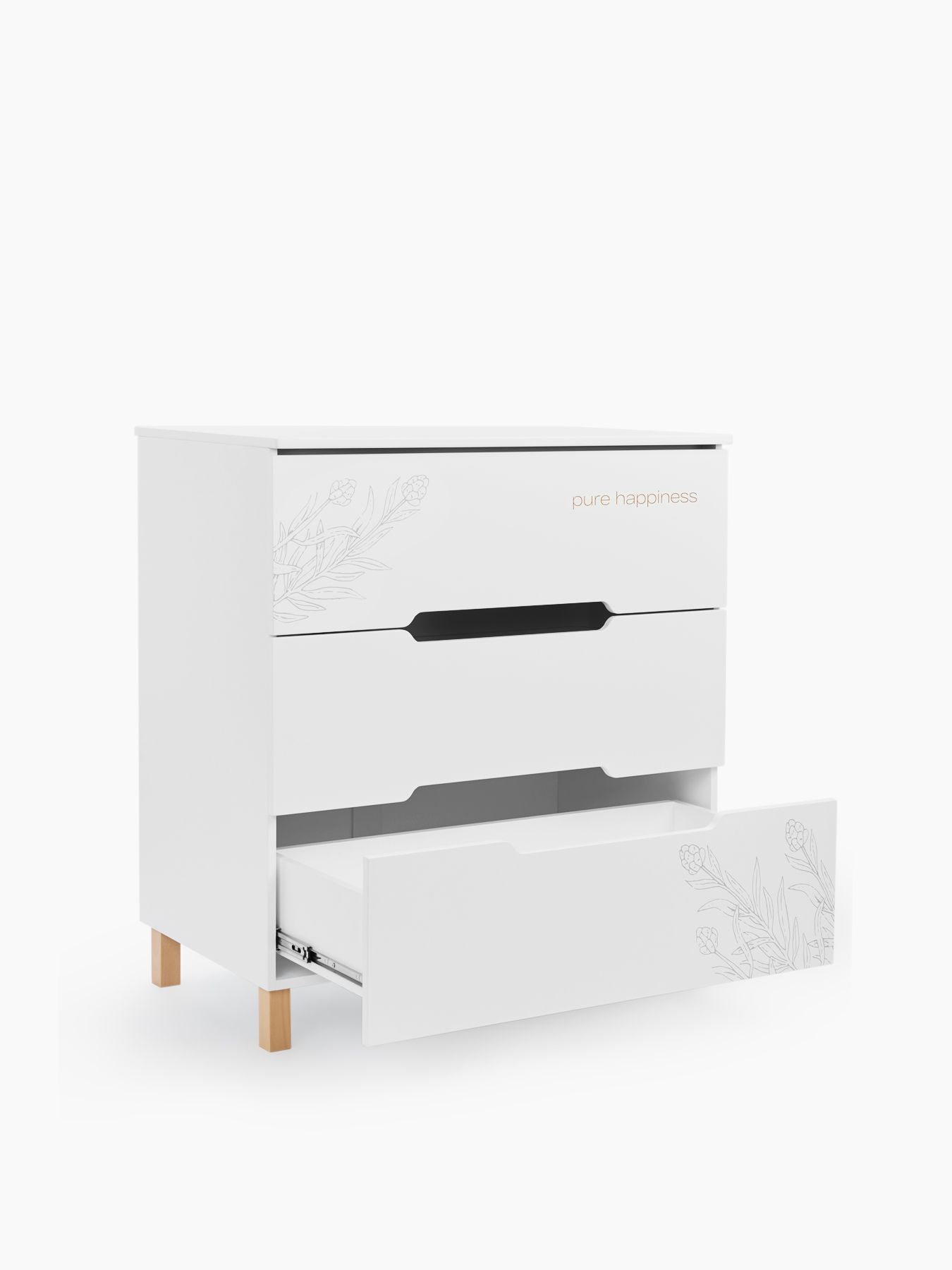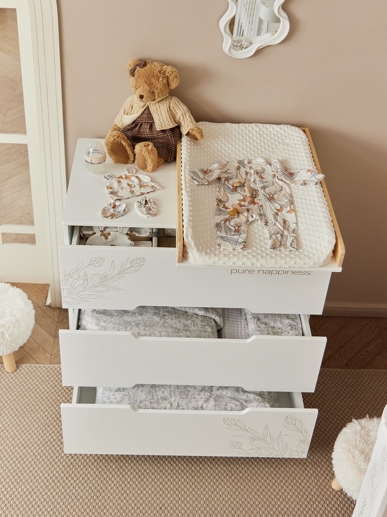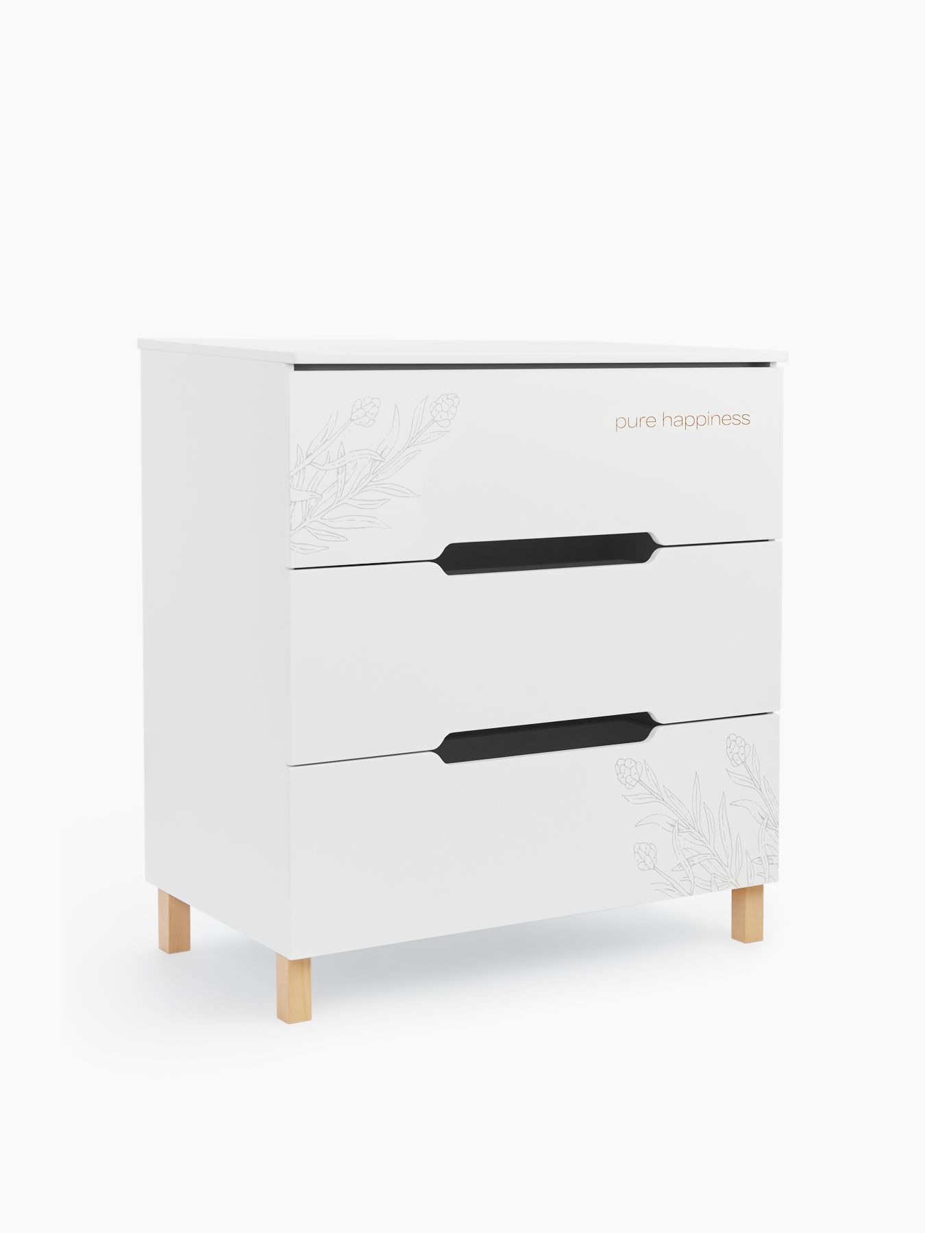 Happy Baby FIOKI — вместительный комод с продуманным пеленальным столиком и высокими бортиками для абсолютной безопасности. Стильный акцент в детской и максимум комфорта — глубокие ящики плавно открываются, а ножки из натурального дерева придают интерьеру особый уют.