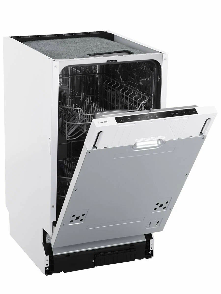 HYUNDAI HBD 450 — встраиваемая посудомоечная машина шириной 45 см монтируется в нишу 820х450х580 мм. Модель с загрузкой до девяти комплектов посуды обладает габаритами 815х448х550 мм и весом 32,5 кг. Кухонная утварь размещается на двух уровнях. Нижний короб позволяет размещать крупногабаритную кухонную утварь.