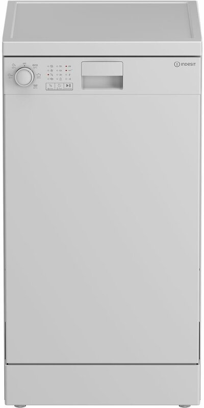 Indesit DFS 1A59 — благодаря 2 корзинам с полками и держателями посудомоечная машина вмещает 10 комплектов и тщательно отмывает посуду при полной загрузке. Модель допускает подвод воды с нагревом до 25 °C. Вы можете выбирать 1 из 5 программ, в том числе экономичный или быстрый цикл мойки. В режиме половинной загрузки ПММ требует меньше времени, воды и энергии.