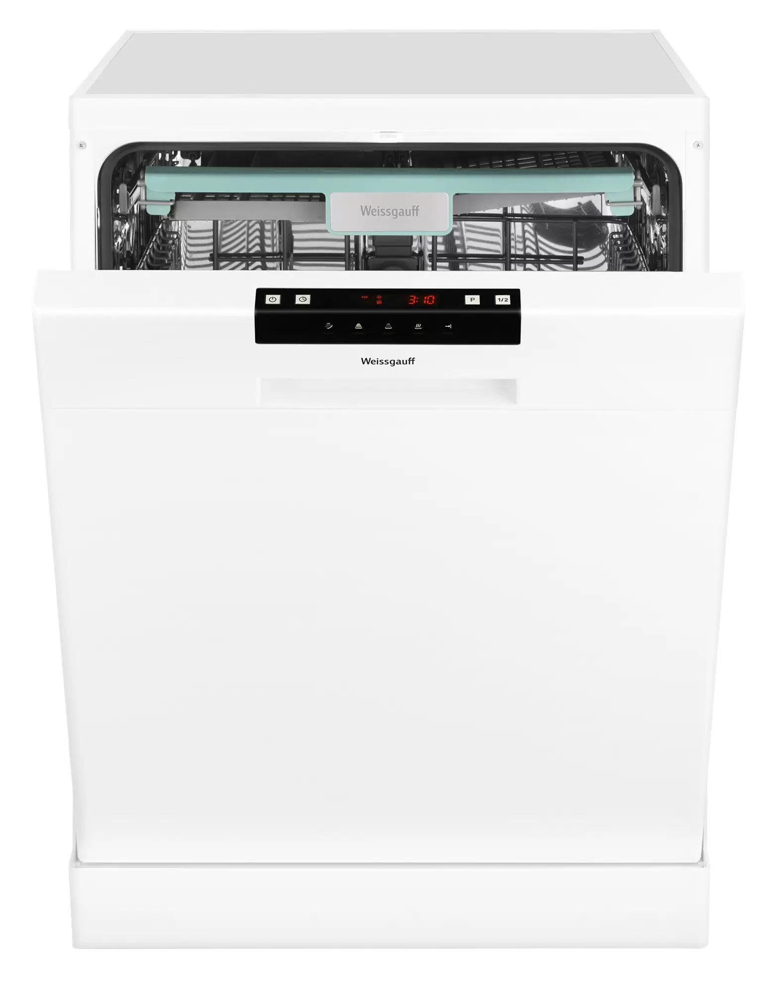 Weissgauff DW 6035 — полноразмерная отдельностоящая посудомоечная машина для кухни. Техника с электронным управлением, тремя эргономичными корзинами и вместимостью посуды до 14 комплектов. Вы сможете помыть большое количество посуды, не тратя свое время. Ложки, вилки и ножи можно положить отдельно в верхнем лотке. Если тарелок и кастрюль немного, воспользуйтесь опцией половинной загрузки — режим экономно расходует воду и электричество. Забытые на столе кружки можно загрузить, даже если мойка началась: функция дозагрузки позволяет это сделать. Быстрый режим помогает управиться с мойкой оперативнее: мойка для посуды очистит тарелки от загрязнений за минимальное время. Режим «Стекло» подходит для стеклянных стаканов и бокалов — вы достанете из посудомойки для кухни сухие фужеры без разводов.