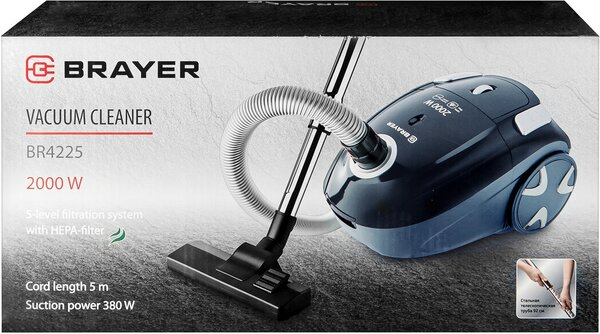 Brayer BR4225 — Пылесос мешковой BRAYER BR4225 - мощный и эффективный помощник в уборке вашего дома. Максимальная мощность пылесоса составляет 2000 Вт, а мощность всасывания - 380 Вт, что обеспечивает быстрое и качественное удаление пыли и грязи с различных поверхностей. 5-ступенчатая система фильтрации с HEPA-фильтром гарантирует тщательную очистку воздуха от пыли и аллергенов, позволяя использовать пылесос в помещениях с аллергиками и детьми. Регулировка мощности всасывания осуществляется на корпусе пылесоса, что делает его использование еще более удобным. Емкость мешка для пыли составляет 2,5 литра, что обеспечивает продолжительное время работы без необходимости его частого опустошения. Стальная телескопическая труба позволяет легко менять высоту пылесоса в зависимости от ваших потребностей. Длина сетевого шнура составляет 5 метров, что обеспечивает свободу передвижения во время уборки. Автоматическая смотка шнура экономит место при хранении пылесоса. Пылесос работает от сети 220-240 В, 50/60 Гц, что делает его удобным для использования в большинстве домов. Вес пылесоса составляет всего 5,8 кг, что делает его легким и удобным для перемещения по дому. Выбирая пылесос мешковой BRAYER BR4225, вы получаете надежного помощника в уборке вашего дома, который обеспечит чистоту и свежесть в вашем доме.