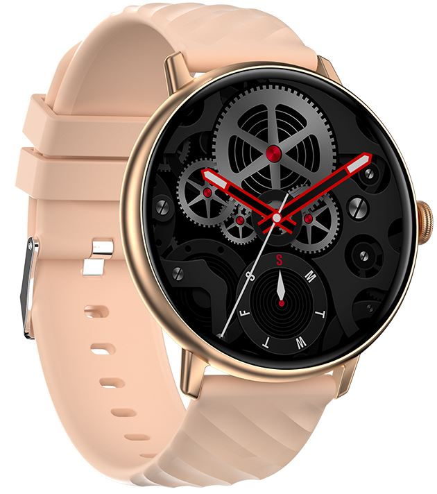 KENSHI C86i — оснащены круглым сенсорным дисплеем в золотистом корпусе и розовым силиконовым ремешком. Устройство удобно облегает запястье, не мешает тренировкам и комфортному сну. Точные датчики считают пройденные шаги, отслеживают пульс, давление и уровень кислорода. Часы контролируют длительность и качество сна, напоминают о долгом отсутствии активности.