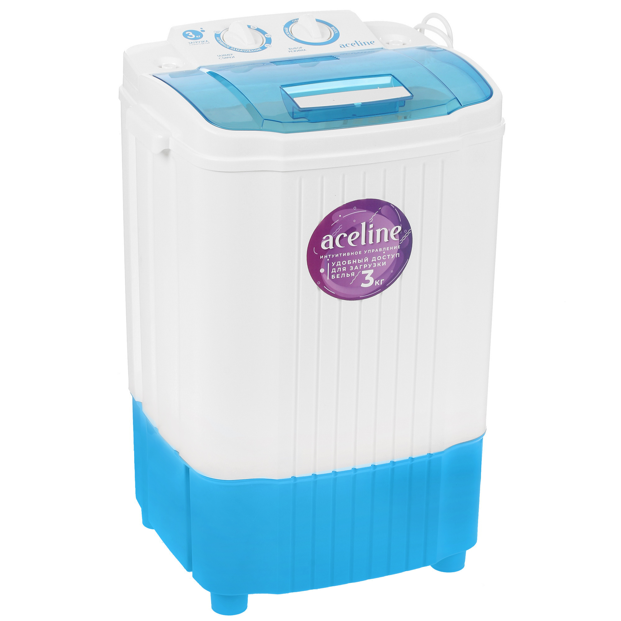 Aceline WM-SA3NRA/WB — стиральная машина относится к моделям полуавтоматического типа и станет надежной помощницей в быту. Одновременно с компактными размерами она предусматривает загрузку до 3 кг белья. Данная модель оснащена двумя программами (бережная/стандартная) и двумя поворотными механическими переключателями, с помощью которых можно осуществлять выбор программ и установку времени работы стиральной машины. Полупрозрачная откидная крышка позволяет визуально контролировать процесс стирки вещей. В конструкции Aceline WM-SA3NRA/WB предусмотрен фильтр для сбора ворса.