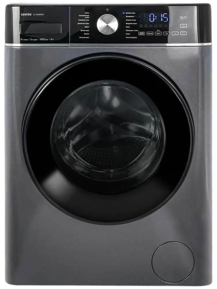 Centek CT-1956 — стирально-сушильная машина рассчитана на загрузку до 8 кг белья при стирке и 5 кг при сушке. Она оснащена 17 автоматическими программами. Интеллектуальный режим SMART на основе датчиков анализирует параметры загруженного белья, после чего подбирает длительность стирки, температуру и количество циклов полоскания.