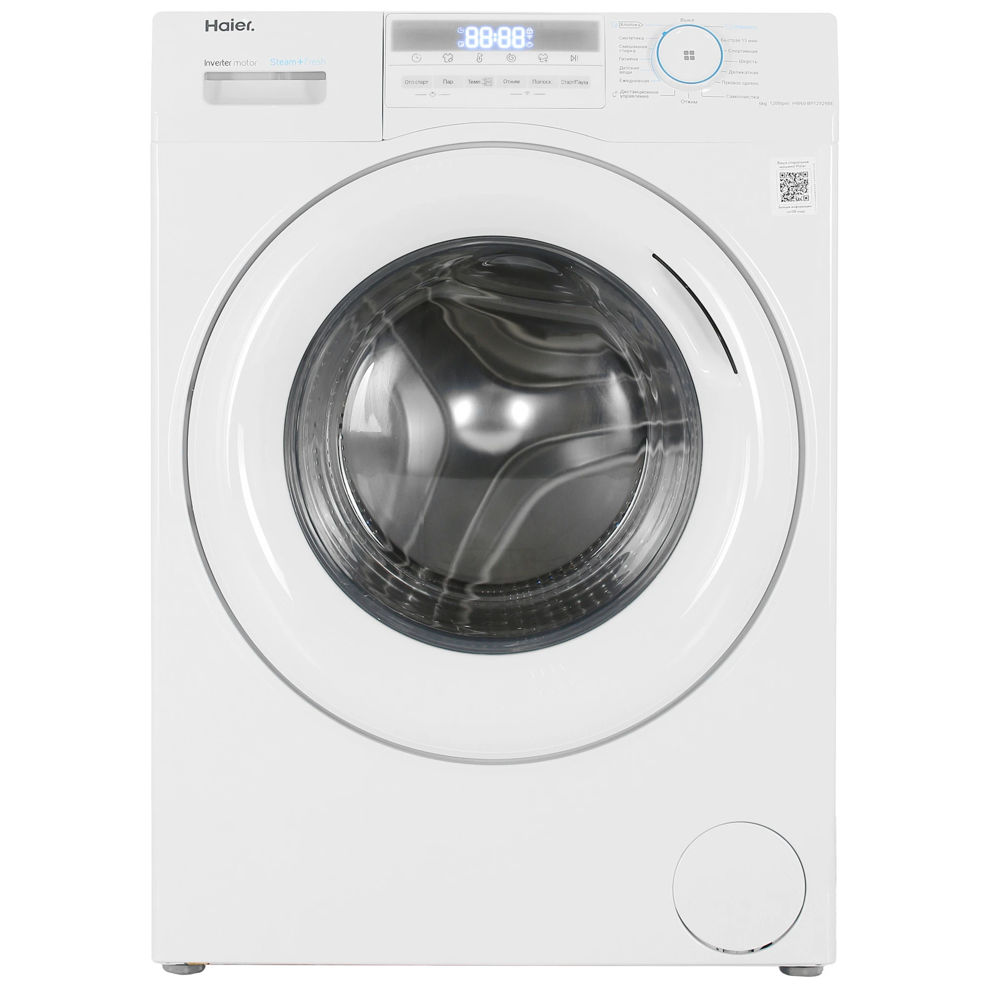 Haier HW60-BP12929BE — стиральная машина с фронтальной загрузкой на 6 кг оборудована инверторным двигателем. Он сокращает уровень производимого шума и расходы на электричество. Для доступа к 15 программам можно воспользоваться приложением EVO. Опция отложенного старта позволяет устройству начать работу в заданный временной интервал.