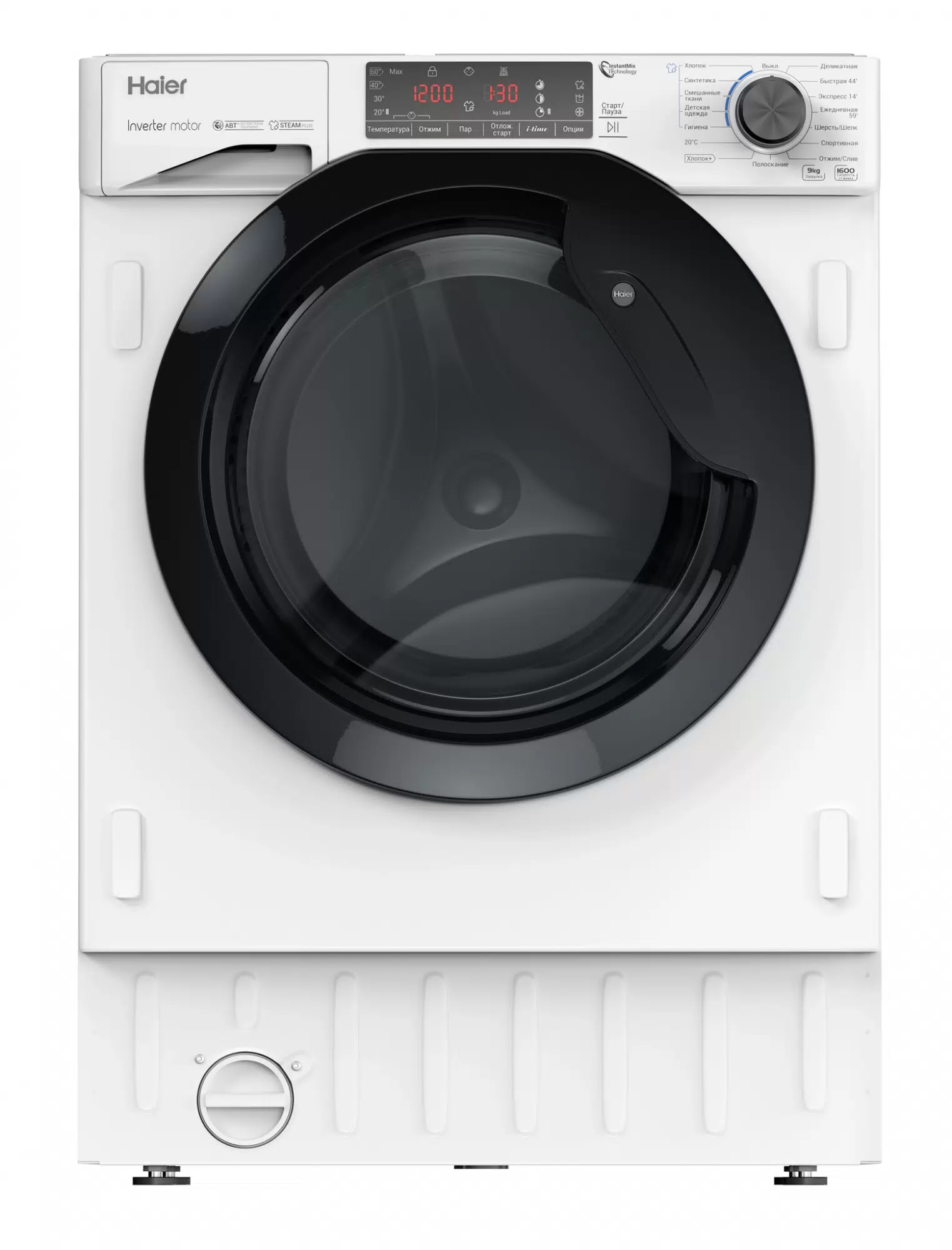 Haier HWQ90B416FWB-RU — встраиваемая стиральная машина белого цвета с черной дверцей люка оснащена инверторным мотором мощностью 1600 Вт. Модель с фронтальной загрузкой вмещает до 9 кг белья. Бак изготовлен из полипропилена. Объем барабана составляет 58 л, расход воды за цикл — 48,2 л.